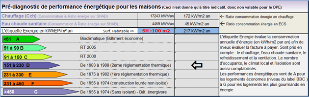 Le niveau de consommation d'énergie (kWh /m.2an) est exprimé par le ratio des consommations d'énergie thermique annuelle pour le chauffage et l’ECS divisé par la surface habitable de l’habitat.